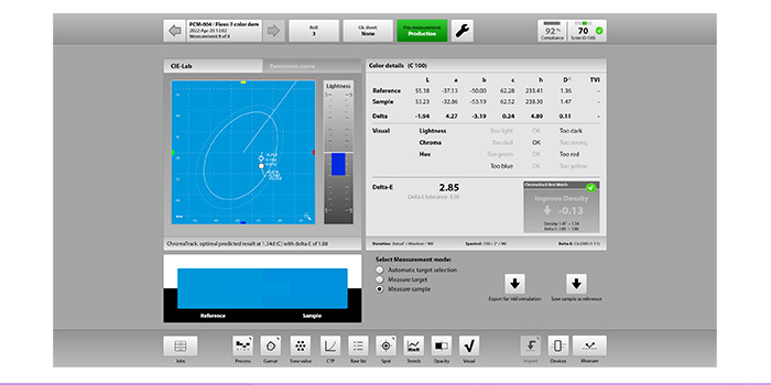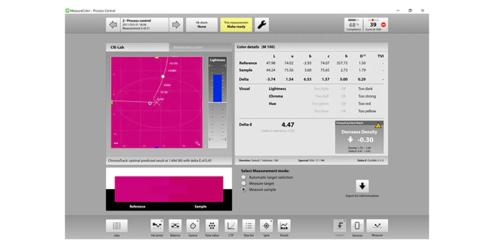 MeasureColor的ChromaTrack功能通過分析和計算理想的DeltaE色彩匹配來改善色彩管理。它可針對特定色彩生成相應的油墨密度調整建議,并告知操作人員目標密度和預期的DeltaE值。通過可視化地跟蹤色彩調整,ChromaTrack簡化了印刷機獲得精確一致色彩的過程。